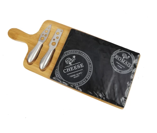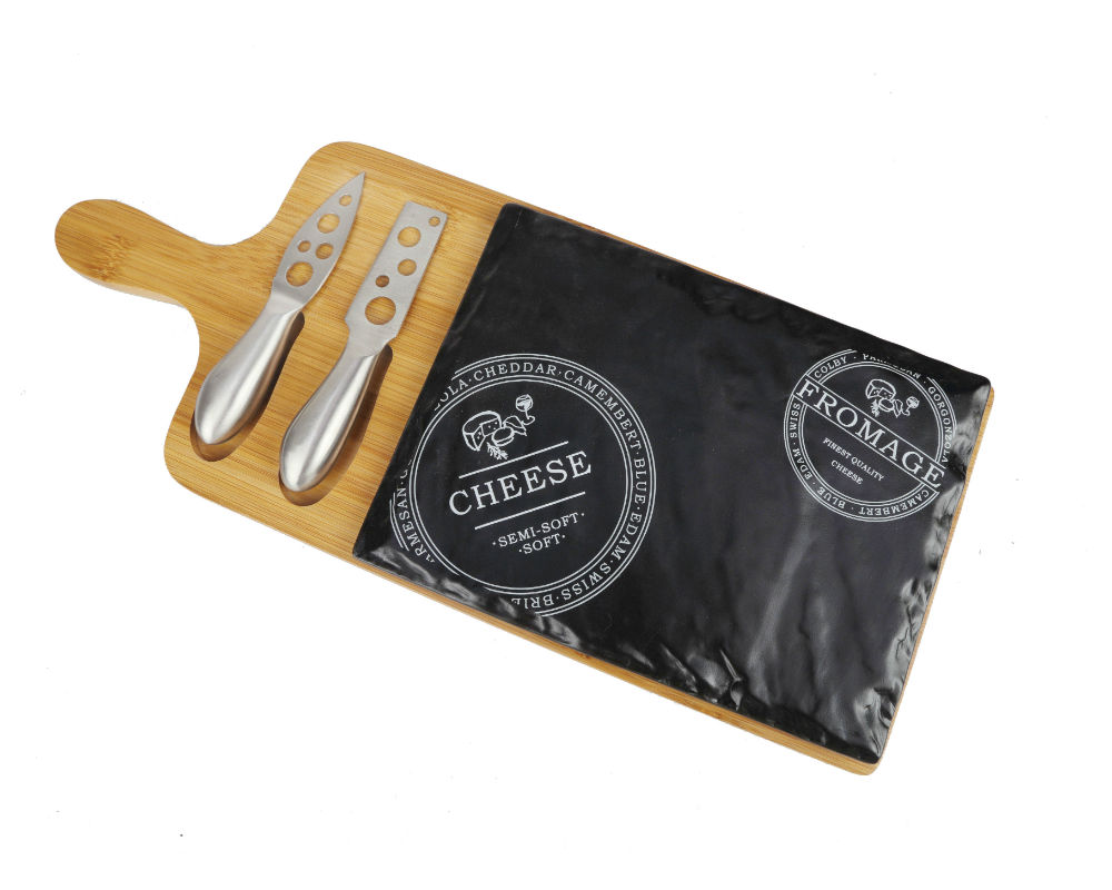- Ξύλινη βάση με πλατό stoneware & 2 ανοξείδωτα εξαρτήματα κοπής και σερβιρίσματος τυριού