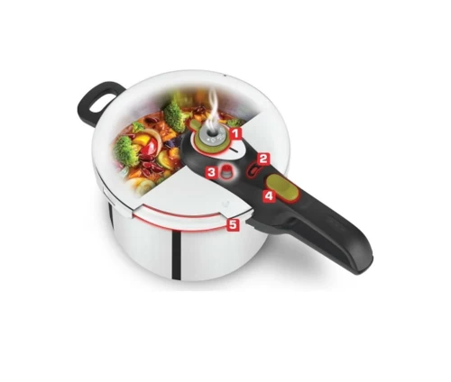 - 5 συστήματα ασφαλείας: 3 ασφάλειες για την πίεση και 2 ασφάλειες ανοίγματος και κλειδώματος