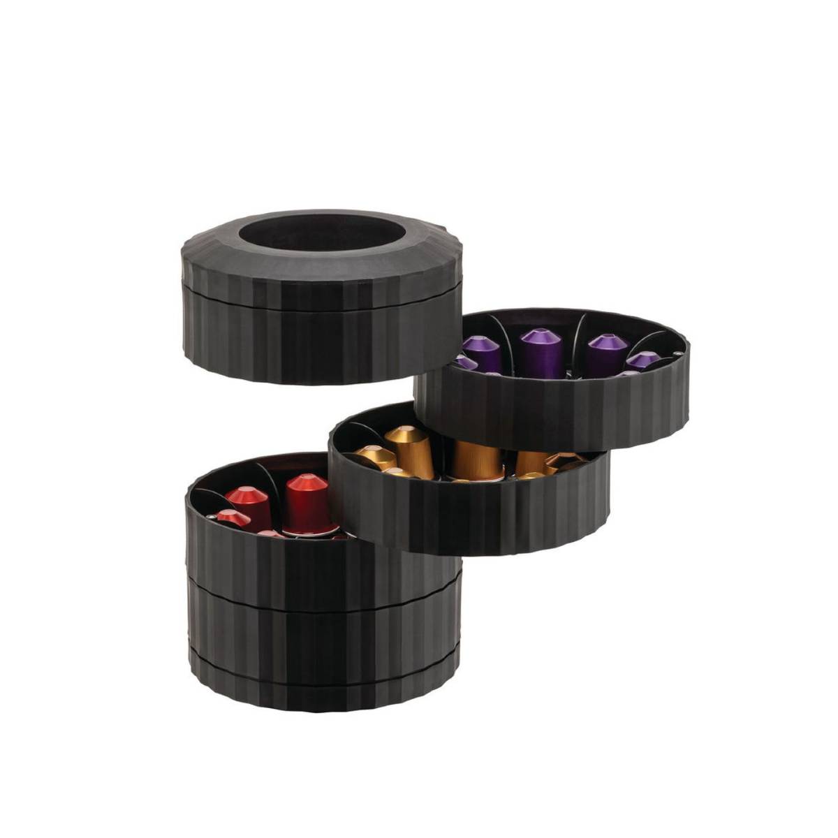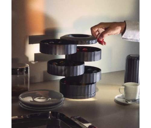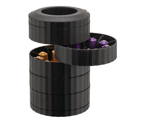 - Μεγάλη Χωρητικότητα: Διαθέτει 5 ανεξάρτητα, περιστρεφόμενα ράφια που μπορούν να φιλοξενήσουν συνολικά έως και 40 κάψουλες (τύπου Nespresso ή παρόμοιου μεγέθους).