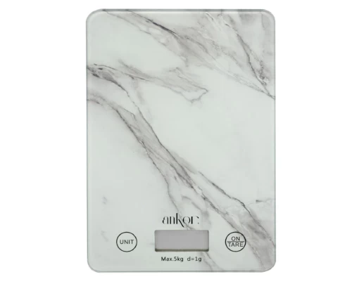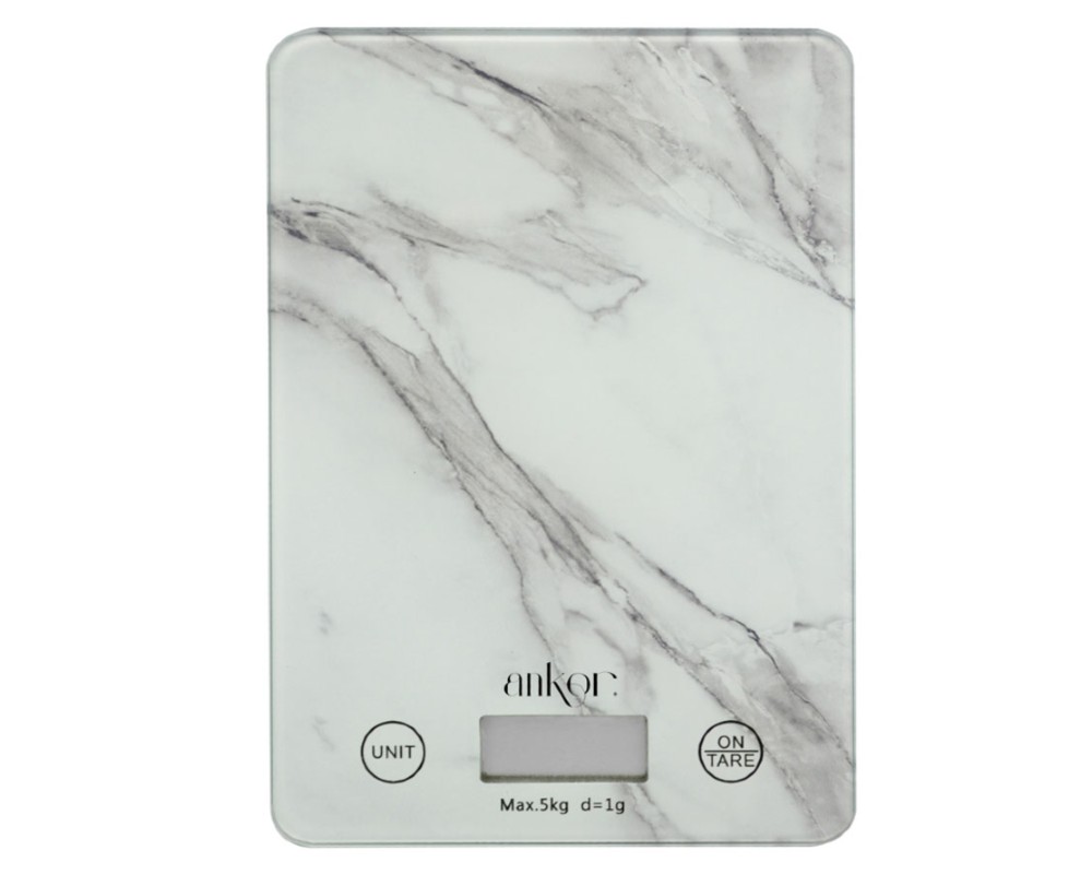 Ηλεκτρονική ζυγαριά Ankor με γυάλινη επιφάνεια υψηλής ποιότητας και κομψό σχέδιο μάρμαρο, ιδανική για κάθε σύγχρονη κουζίνα. Διαθέτει λειτουργία απόβαρου, επιλογή μονάδας μέτρησης, αντιολισθητικά πέλματα για σταθερότητα και αυτόματη απενεργοποίηση για μεγαλύτερη διάρκεια ζωής της μπαταρίας.