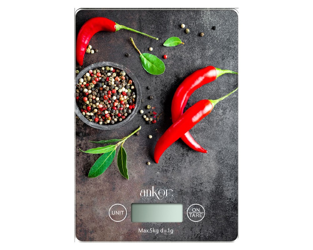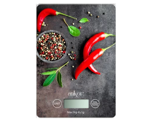 Ηλεκτρονική ζυγαριά Ankor με ανθεκτική γυάλινη επιφάνεια και μοντέρνο σχέδιο με κόκκινες πιπεριές. Ιδανική για καθημερινή χρήση στην κουζίνα, προσφέρει ακρίβεια στη μέτρηση και διαθέτει λειτουργία απόβαρου, επιλογή μονάδας μέτρησης και αυτόματη απενεργοποίηση για εξοικονόμηση ενέργειας.