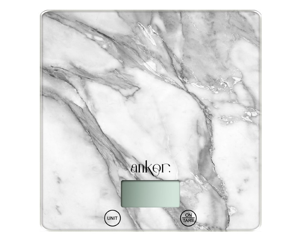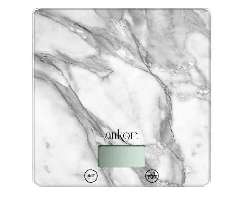 Ηλεκτρονική ζυγαριά Ankor με επιφάνεια από γυαλί υψηλής ποιότητας και κομψό σχέδιο μάρμαρο. Διαθέτει λειτουργία απόβαρου, επιλογή μονάδας μέτρησης και αντιολισθητικά πέλματα για σταθερότητα και ασφάλεια. Η αυτόματη απενεργοποίηση παρατείνει τη διάρκεια ζωής της μπαταρίας. Ιδανική για κάθε κουζίνα, συνδυάζοντας ακρίβεια, ανθεκτικότητα και κομψότητα.