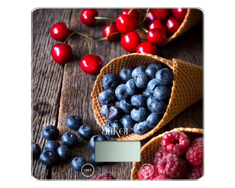 Ηλεκτρονική ζυγαριά Ankor με επιφάνεια από γυαλί υψηλής ποιότητας σε σχέδιο μύρτιλο. Διαθέτει λειτουργία απόβαρου, επιλογή μονάδας μέτρησης και αντιολισθητικά πέλματα για σταθερότητα. Απενεργοποιείται αυτόματα για εξοικονόμηση ενέργειας και μεγαλύτερη διάρκεια ζωής. Ιδανική για καθημερινή χρήση στην κουζίνα σας με ακρίβεια και στυλ.