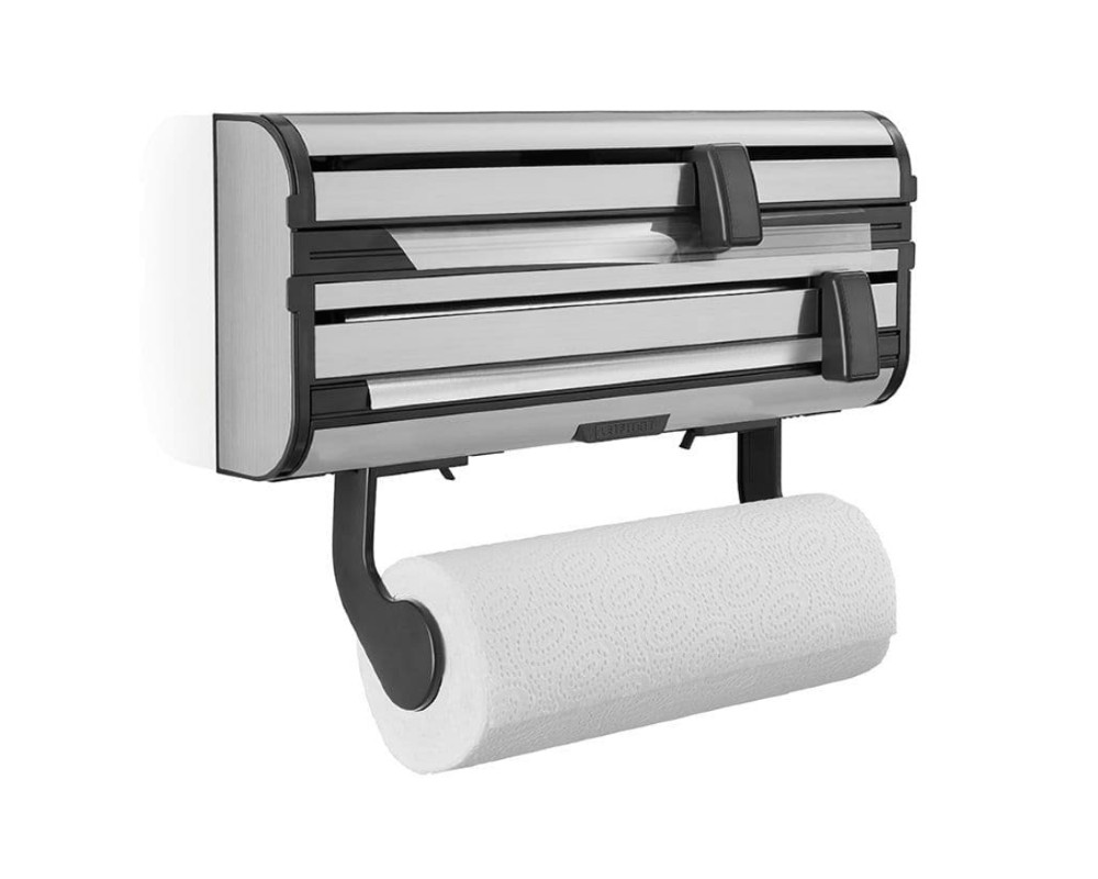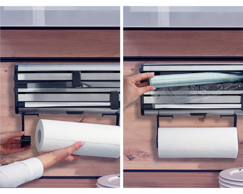 - Θήκη για χαρτί κουζίνας αλουμινόχαρτο και διαφάνεια με ενσωματωμένες λεπίδες για ακριβή και εύκολη κοπή
