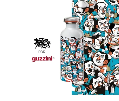 Το Guzzini Street Bottle είναι το αποκλειστικό θερμικό μπουκάλι ταξιδιού που ολοκληρώθηκε με το έργο του MISTER THOMS, του καλλιτέχνη με έδρα τη Ρώμη, οι δημιουργίες του οποίου είναι ένα εξαιρετικό μείγμα ειρωνείας και καλλιτεχνικής έκφρασης. Το μπουκάλι, μπορεί να διατηρήσει τα ποτά σε σταθερή θερμοκρασία (12 ώρες για ζεστά και 24 ώρες για κρύα ροφήματα) είναι κατασκευασμένο από ανοξείδωτο ατσάλι, με αεροστεγές καπάκι στεγανό, στεγανό. Αδιάβροχο και ανθεκτικό στις κρούσεις.