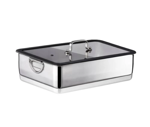 Διαθέτει γυάλινο καπάκι από σκληρυμένο γυαλί, με περιμετρικό χείλος σιλικόνης, σχεδιασμένο ώστε να διατηρεί τη φυσική υγρασία και τη ζουμερή υφή των τροφίμων, ακόμη και σε παρατεταμένες μαγειρικές διαδικασίες. Το υψηλό χείλος 8 εκ. προσφέρει ευελιξία και άνεση στη χρήση, ενώ οι αναδιπλούμενες ανοξείδωτες λαβές διευκολύνουν τον χειρισμό και την αποθήκευση.