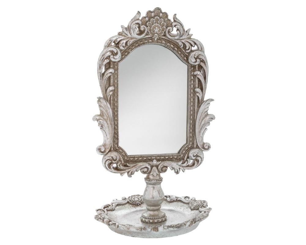 Αναβαθμίστε τη διακόσμηση του μπουντουάρ, της κρεβατοκάμαρας ή της εισόδου σας με αυτόν τον υπέροχο επιτραπέζιο καθρέφτη. Ο περίτεχνος, σκαλιστός σχεδιασμός του σε συνδυασμό με την αντικέ ασημί απόχρωση (silver antique) αποπνέει μια αίσθηση πολυτέλειας και ρομαντισμού, φέρνοντας vintage γοητεία στον χώρο.