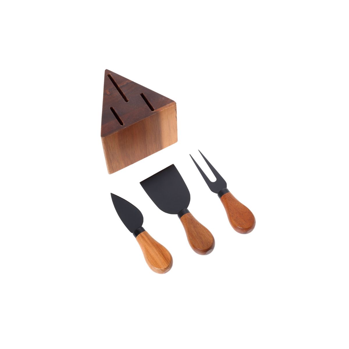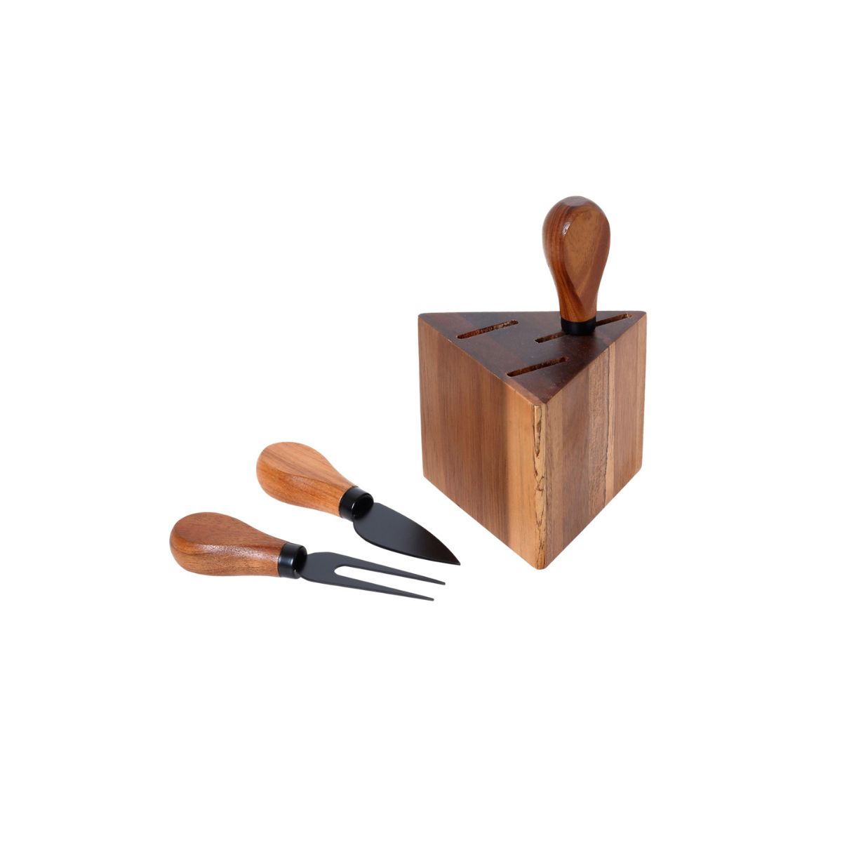 Η ξύλινη βάση σε τριγωνικό σχήμα οργανώνει όμορφα τα μαχαίρια και τα διατηρεί πάντα διαθέσιμα στο τραπέζι ή στον πάγκο. Παράλληλα, λειτουργεί και ως διακοσμητικό στοιχείο παρουσίασης, ιδανικό για cheese platters, μπουφέ, τραπέζια με κρασί ή πιο ιδιαίτερες στιγμές φιλοξενίας.
