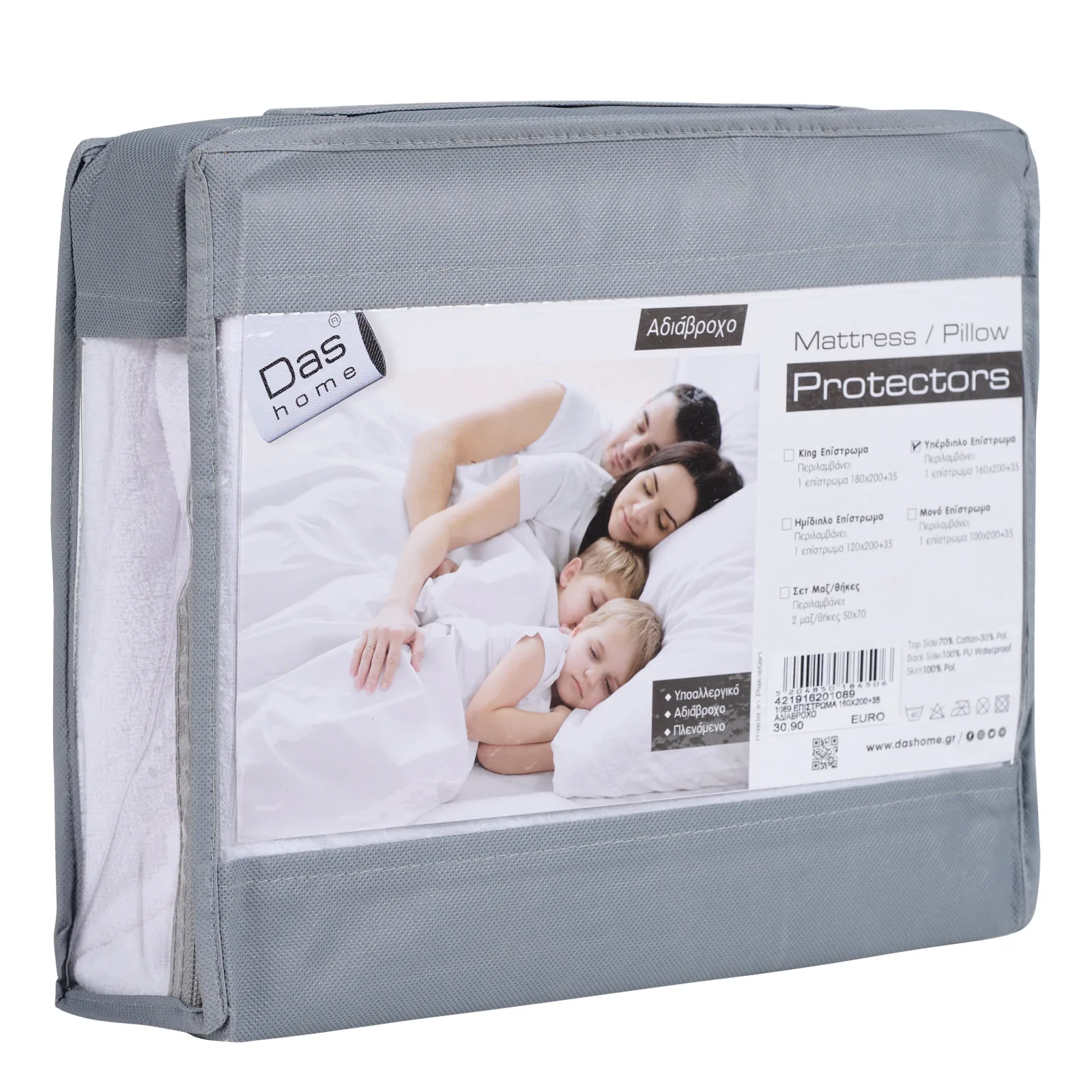 Αδιάβροχο επίστρωμα από βαμβακερό ύφασμα προκειμένου να επιτρέπει τη φυσική αναπνοή του σώματος κατά τη διάρκεια του ύπνου, με ειδική επεξεργασία PU στο κάτω μέρος για πλήρη προστασία από την υγρασία. Διατίθεται σε διάσταση 160Χ200+35cm. Επίστρωση: 70% cotton - 30% pol. Kάτω μέρος: pu.