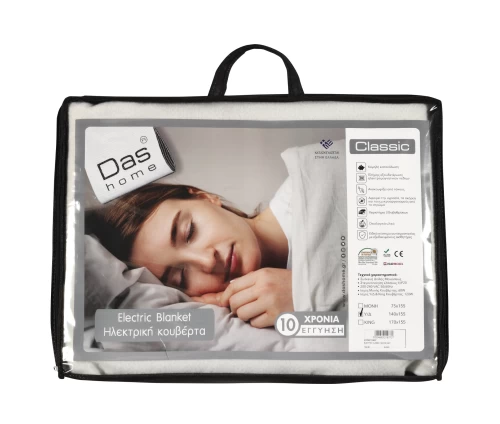 Das home ηλεκτρική κουβέρτα νέας τεχνολογίας σε διάσταση 140Χ155εκ. Διαθέτει 2 χειριστήρια 3 διαβασμίσεων για ανεξάρτητη ρύθμιση θερμοκρασίας σε κάθε πλευρά και αυτόματο έλεγχο υπερθέρμανσης για προστασία. Είναι προϊόν ελληνικής κατασκευής, 100% polyester. Das home...makes your house a home!