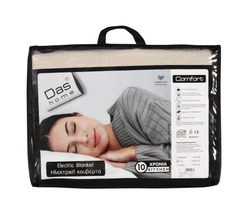Das home ηλεκτρική κουβέρτα νέας τεχνολογίας με αυτόματο έλεγχο υπερθέρμανσης για προστασία. Διαθέτει χειριστήριο 3 διαβασμίσεων για τη ρύθμιση της θερμοκρασίας. Η πάνω πλευρά της ηλεκτρικής κουβέρτας είναι 100% οικολογικό βαμβάκι και η κάτω πλευρά απο 100%. Κατασκευάζεται στην Ελλάδα σε διάσταση 140Χ155εκ. Das home...makes your house a home!