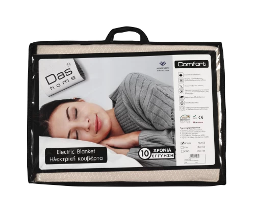 Das home ηλεκτρική κουβέρτα νέας τεχνολογίας με αυτόματο έλεγχο υπερθέρμανσης για προστασία. Διαθέτει χειριστήριο 3 διαβασμίσεων για τη ρύθμιση της θερμοκρασίας. Η πάνω πλευρά της ηλεκτρικής κουβέρτας είναι 100% οικολογικό βαμβάκι και η κάτω πλευρά απο 100%. Κατασκευάζεται στην Ελλάδα σε διάσταση 75Χ155εκ. Das home...makes your house a home!