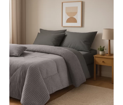 Κουβερτοπάπλωμα μονόχρωμο από ύφασμα fleece και γούνα sherpa. Το εξωτερικό του ύφασμα είναι από 100% pol. ενώ το εσωτερικό του αποτελείται από ίνες hollowfibre, ειδικά μελετημένο για απαλή υφή. Ιδιαίτερα ζεστό, υποαλλεργικό, μαλακό και ανθεκτικό στη χρήση με βάρος 750gr/m², με θερμιδική απόδοση 12TOG. Διατίθεται σε διάσταση 220Χ240εκ. Das home...makes your house a home!