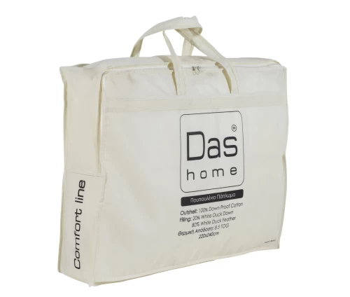 Πουπουλένιο πάπλωμα Das home της σειράς Comfort. Το κάλυμμα του είναι από 100% υποαλλεργικό βαμβακι, ειδικά επεξεργασμένο για την συγκράτηση του υλικού γεμίσματος, ενώ το εσωτερικό γέμισμα είναι από 20% πούπουλο πάπιας και 80% φτεράκι. Είναι ιδιαίτερα "αφράτο" με θερμότητα 8.5 Tog και διατίθεται σε διάσταση 220Χ240. Das home...makes your house a home!