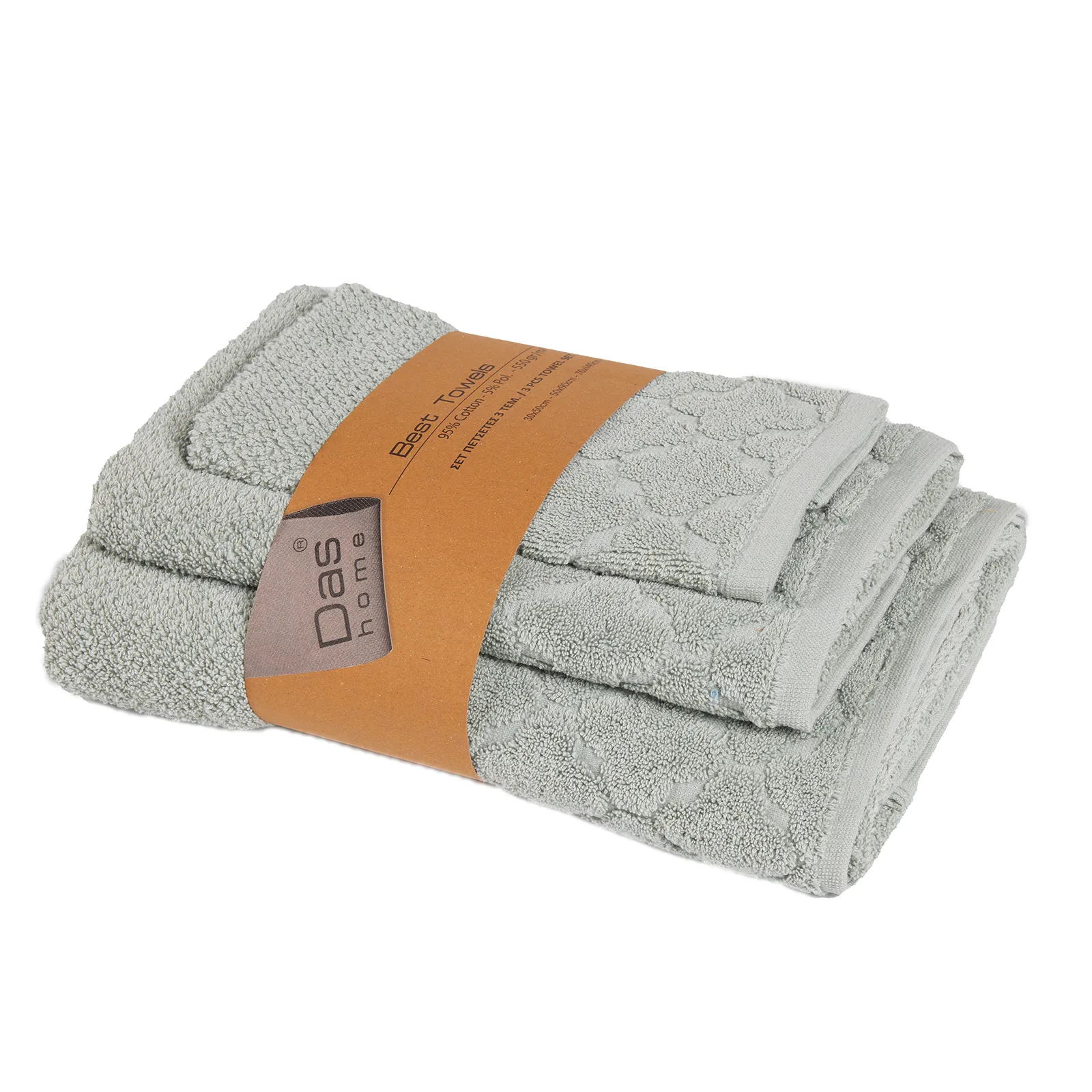 Σετ πετσέτες 3 τεμαχίων της σειράς Best. Είναι από 95% βαμβάκι υψηλής ποιότητας και 5%pol, ιδιαίτερα απαλές, απορροφητικές και ανθεκτικές στην χρήση με βάρος 550gr/m2. Τα χρώματα που χρησιμοποιούνται είναι ανεξίτηλα και υποαλλεργικά. Το σετ αποτελείται από μία πετσέτα μπάνιου 70Χ140εκ, μία πετσέτα προσώπου 50Χ90εκ και μία πετσέτα χεριών 30Χ50εκ. Das home...makes your house a home!