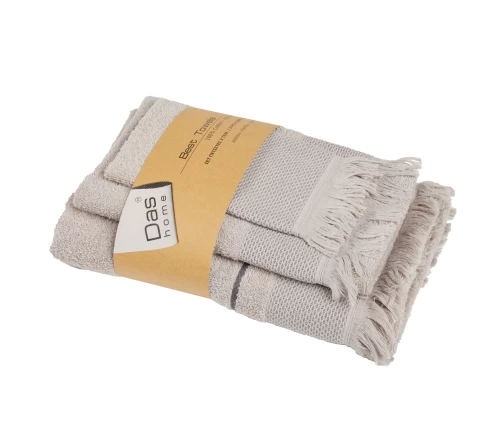 Σετ πετσέτες 3 τεμαχίων της σειράς Best, με διακοσμητική μπορντούρα και κρόσια. Είναι από 100% βαμβάκι υψηλής ποιότητας, ιδιαίτερα απαλές, απορροφητικές και ανθεκτικές στην χρήση με βάρος 450gr/m2. Τα χρώματα που χρησιμοποιούνται είναι ανεξίτηλα και υποαλλεργικά. Το σετ αποτελείται από μία πετσέτα μπάνιου 70Χ140εκ., μία πετσέτα προσώπου 50Χ90εκ. και μία πετσέτα χεριών 30Χ50εκ. Das home...makes your house a home!