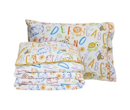 Σετ παπλωματοθήκη της σειράς Kid, με χαρούμενες παραστάσεις. Είναι από 70% υποαλλεργικό βαμβάκι και 30% πολυεστέρα με πυκνότητα ύφανσης 150 TC, απαλή στην αφή, ανθεκτικό στη χρήση και με ειδική επεξεργασία για εύκολο σιδέρωμα. Το σετ περιλαμβάνει μία παπλωματοθήκη διάστασης 160Χ240εκ και μία μαξιλαροθήκη 50Χ70εκ. Das home...makes your house a home!