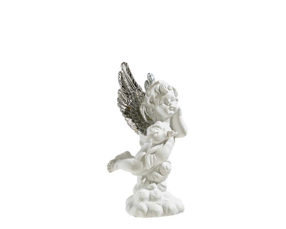 Καθισμένο ονειρικά πάνω σε ένα σύννεφο, αυτό το αγγελάκι ξεχωρίζει για την τρυφερή του έκφραση και τις εντυπωσιακές, λεπτομερείς φτερούγες του σε κομψό ασημί χρώμα. Η αντίθεση του λευκού με το ασημί δημιουργεί ένα εκλεπτυσμένο και φωτεινό αποτέλεσμα που ταιριάζει σε κάθε στυλ διακόσμησης.