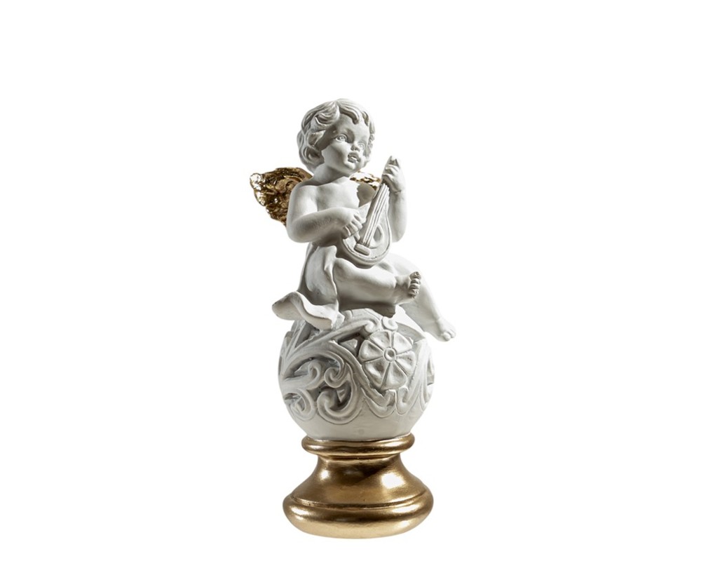 Αυτό το πανέμορφο κομμάτι ξεχωρίζει για τον μοναδικό του σχεδιασμό. Το αγγελάκι απεικονίζεται να παίζει λαούτο, καθισμένο με χάρη πάνω σε μια περίτεχνη σφαίρα με ανάγλυφα, φλοράλ σχέδια. Η βάση της φιγούρας σε πολυτελές χρυσό χρώμα, που ταιριάζει αρμονικά με τα διακριτικά χρυσά φτερά, προσφέρει εξαιρετική στήριξη και προσθέτει μια αριστοκρατική πινελιά.