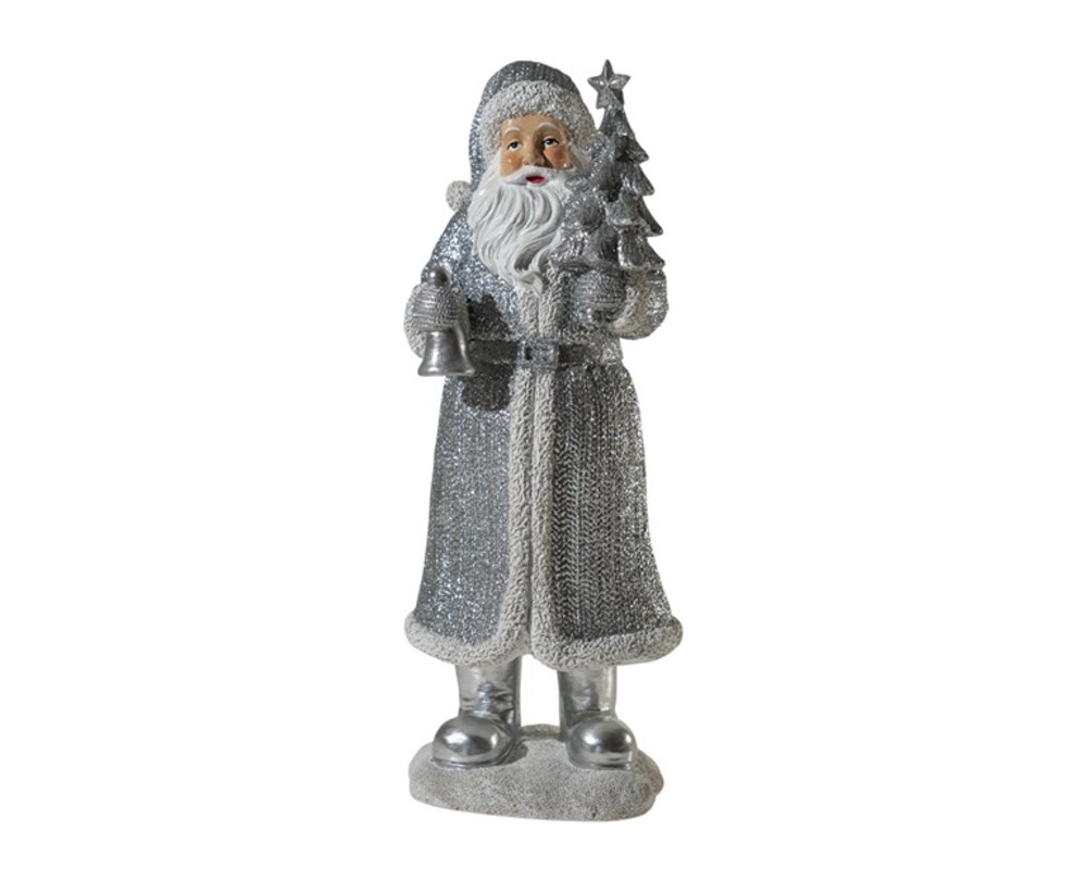 Στο ένα χέρι κρατά ένα στολισμένο ασημί δεντράκι και στο άλλο μια ασημί καμπάνα, έτοιμος να φέρει τη λάμψη των γιορτών. Κατασκευασμένος από ανθεκτικό πολυεστερικό υλικό (polyresin), εξασφαλίζει ποιότητα και σταθερότητα.