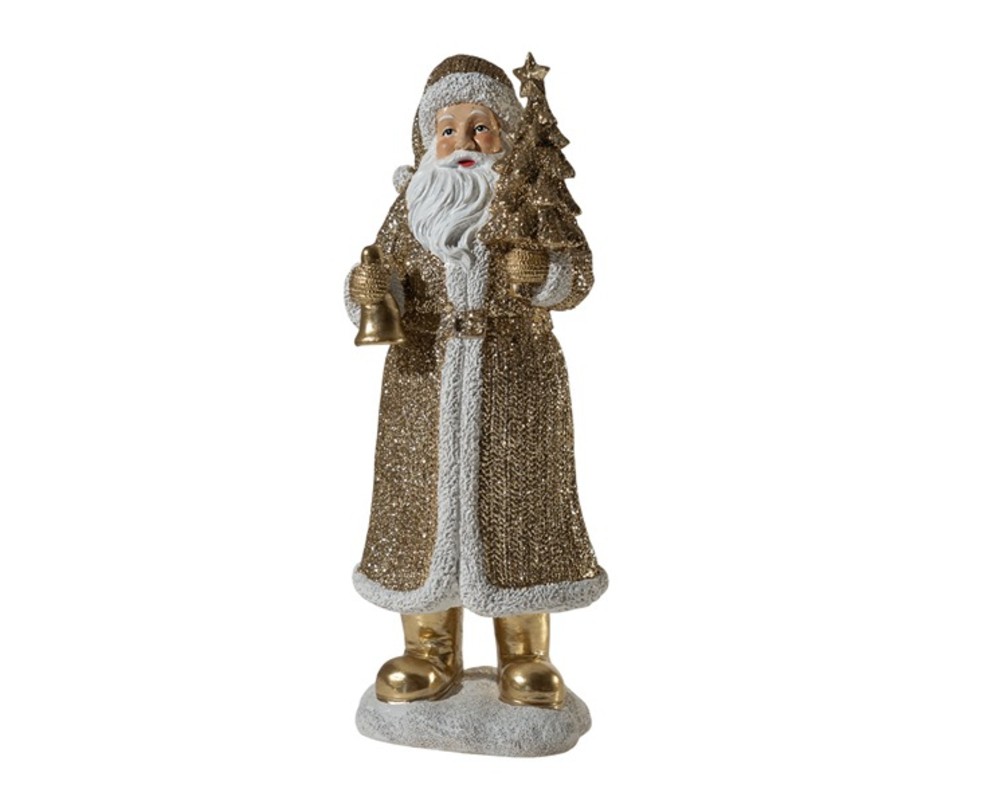 Στο ένα χέρι κρατά ένα στολισμένο χρυσό δεντράκι και στο άλλο μια χρυσή καμπάνα, έτοιμος να φέρει τη λάμψη και τη χαρά των γιορτών. Κατασκευασμένος από ανθεκτικό πολυεστερικό υλικό (polyresin), εξασφαλίζει ποιότητα και σταθερότητα.