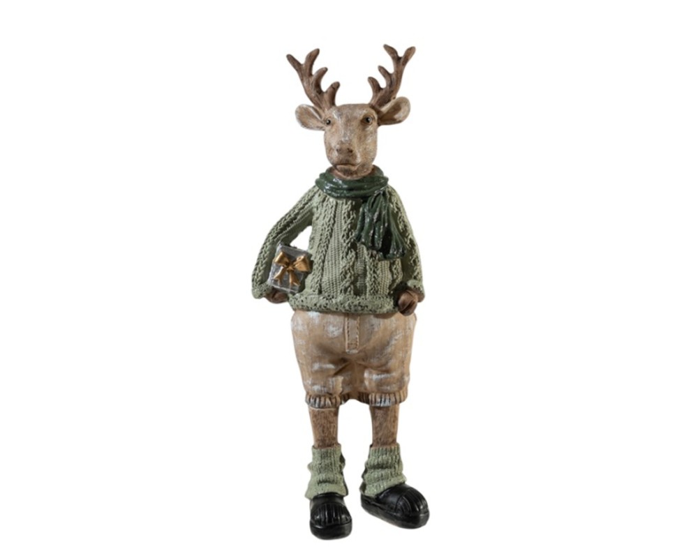 Με ύψος 25 εκατοστά, αυτή η φιγούρα είναι γεμάτη λεπτομέρεια. Ο τάρανδος στέκεται όρθιος, ντυμένος με ένα ζεστό, πλεκτό πράσινο πουλόβερ, ασορτί κασκόλ και γκέτες. Η εμφάνισή του ολοκληρώνεται με μια μπεζ βερμούδα και μαύρα μποτάκια, δίνοντάς του έναν παιχνιδιάρικο και ρουστίκ χαρακτήρα.
