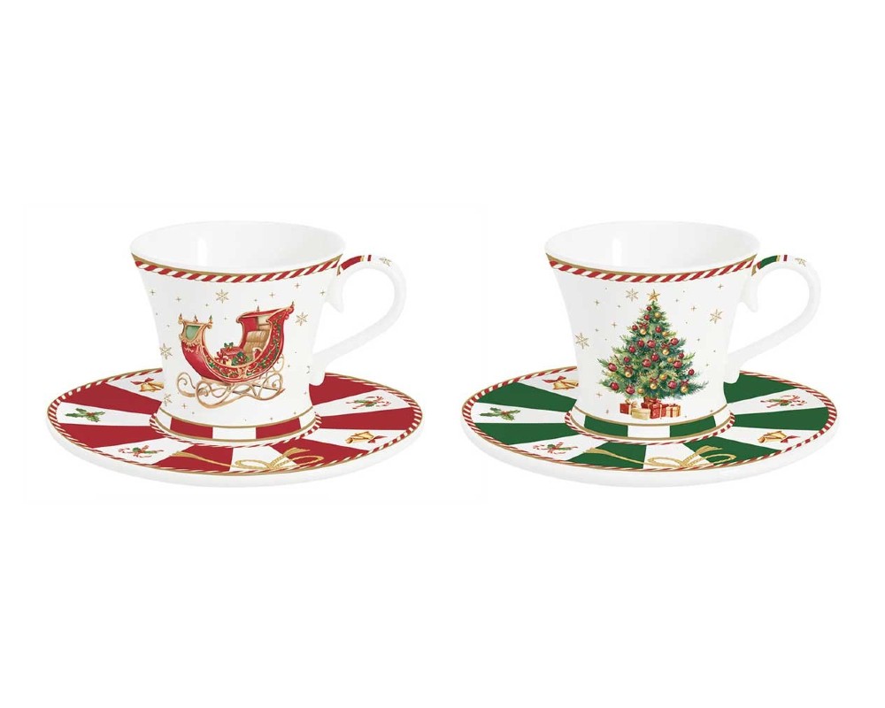 Το σετ αποτυπώνει την κλασική γοητεία των Χριστουγέννων μέσα από δύο διαχρονικά σχέδια. Το ένα φλιτζάνι κοσμείται από ένα πλούσια στολισμένο χριστουγεννιάτικο δέντρο και το άλλο από το μαγικό έλκηθρο του Άγιου Βασίλη. Τα ασορτί πιατάκια με τα καρό μοτίβα σε κόκκινο και πράσινο συμπληρώνουν αρμονικά την εικόνα, δημιουργώντας ένα αποτέλεσμα υψηλής αισθητικής.