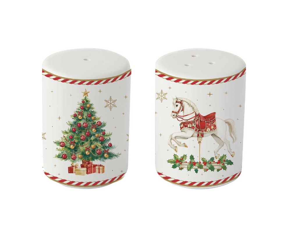 Κατασκευασμένο από πορσελάνη υψηλής ποιότητας, το σετ αποτελείται από δύο δοχεία, ένα για το αλάτι και ένα για το πιπέρι. Το καθένα είναι διακοσμημένο με ένα από τα κλασικά θέματα της σειράς: το ένα με το στολισμένο χριστουγεννιάτικο δέντρο και το άλλο με το κομψό κουνιστό αλογάκι. Το κομψό, κυλινδρικό τους σχήμα και το ύψος των 7 εκατοστών τα καθιστούν διακριτικά και πρακτικά.