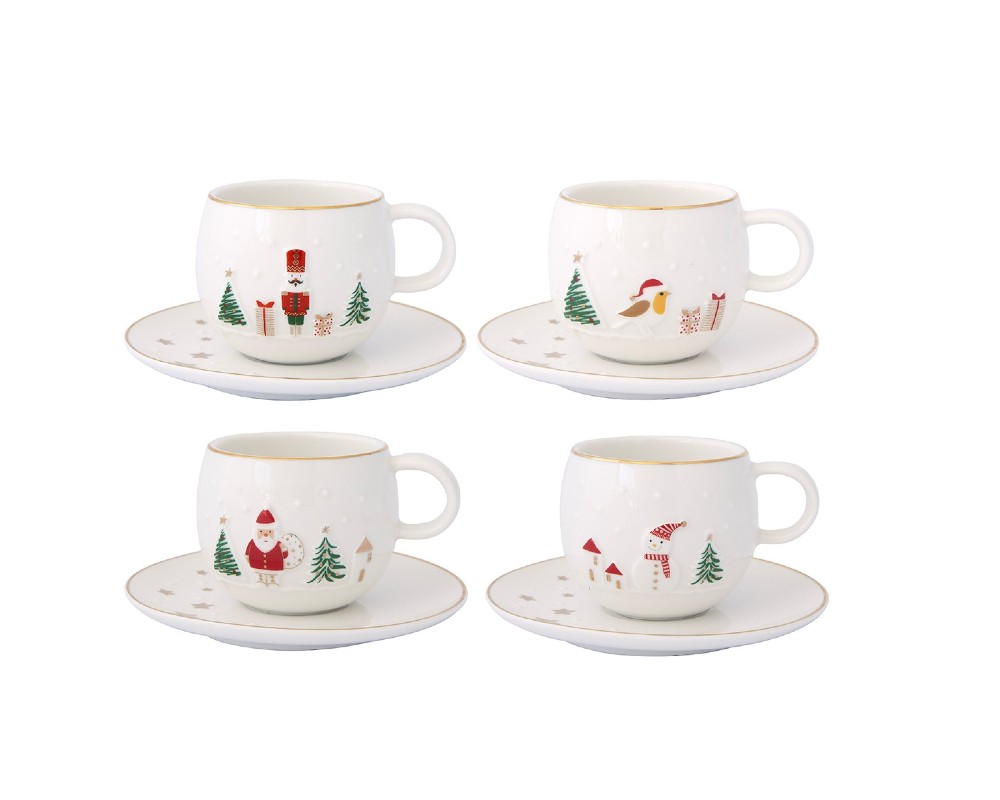 Κάθε σετ περιλαμβάνει δύο πορσελάνινα φλιτζάνια με τα πιατάκια τους, το καθένα διακοσμημένο με μια διαφορετική, γοητευτική χριστουγεννιάτικη φιγούρα: έναν κομψό Καρυοθραύστη, ένα χαριτωμένο πουλάκι με σκουφάκι, τον αγαπημένο μας Άγιο Βασίλη και έναν χαμογελαστό Χιονάνθρωπο. Οι φίνες χρυσές λεπτομέρειες στο χείλος κάθε φλιτζανιού προσθέτουν μια νότα διακριτικής πολυτέλειας.