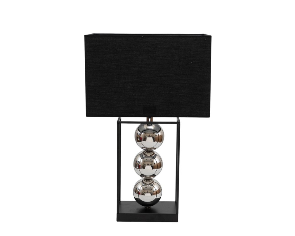 Το συγκεκριμένο επιτραπέζιο φωτιστικό ξεχωρίζει για το παιχνίδι των αντιθέσεων: το αυστηρό, ορθογώνιο πλαίσιο από μαύρο μέταλλο "αγκαλιάζει" τρεις γυαλιστερές ασημί σφαίρες (chrome finish) που βρίσκονται στο κέντρο, δημιουργώντας ένα εντυπωσιακό οπτικό εφέ. Το σύνολο ολοκληρώνεται με ένα κομψό, μαύρο ορθογώνιο καπέλο που διαχέει τον φωτισμό απαλά, προσφέροντας ατμόσφαιρα στον χώρο.