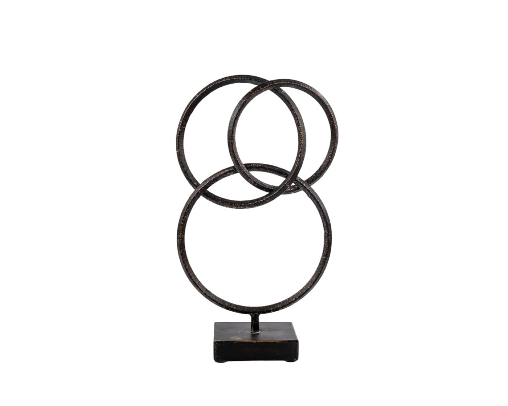 Αναδείξτε τη διακόσμησή σας με αυτό το λιτό αλλά εντυπωσιακό μεταλλικό διακοσμητικό σε βάση. Το σχέδιο με τους αλληλένδετους κύκλους αποπνέει ισορροπία και αρμονία, καθιστώντας το ιδανικό για χώρους με industrial, minimal ή zen αισθητική. Τοποθετήστε το σε τραπεζάκι σαλονιού, μπουφέ ή ραφιέρα για να προσθέσετε μοντέρνο χαρακτήρα.