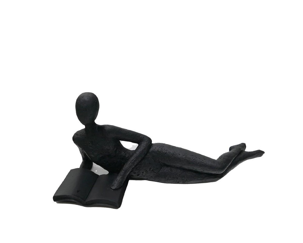 Η φιγούρα απεικονίζει μια αφηρημένη ανθρώπινη μορφή ξαπλωμένη αναπαυτικά, απορροφημένη στην ανάγνωση ενός βιβλίου. Το λιτό, μαύρο φινίρισμα και η λεία υφή της, από υψηλής ποιότητας πολυρεζίνη (polyresin), αναδεικνύουν την κομψότητα και τη μοντέρνα αισθητική της, καθιστώντας την ένα διακριτικό αλλά και ουσιώδες στοιχείο διακόσμησης.