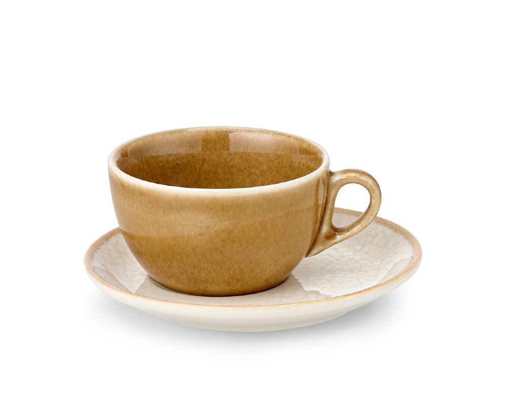 Αισθητικά, ακολουθεί τον εντυπωσιακό συνδυασμό της σειράς: το φλυτζάνι σε γυαλιστερή καραμελέ/ώχρα απόχρωση που προσδίδει ζεστασιά, και το πιατάκι σε υπόλευκο χρώμα με την ιδιαίτερη "craquelé" (σπασμένη) υφή και το καφέ τελείωμα στο χείλος.