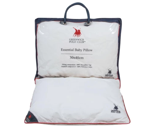 Μαξιλάρι baby της σειράς Essential. O οίκος Greenwich Polo Club έχει επιλέξει για το μωρό σας υφάσματα από 100% υποαλλεργικό βαμβάκι 250TC για το εξωτερικό περίβλημα του μαξιλαριού ενώ το εσωτερικό του αποτελείται από ίνες microfibre, βάρους 75g, ειδικά μελετημένο ώστε να προσφέρει ιδιαίτερα απαλή υφή για το μωρό ενώ συγχρόνως να είναι ανθεκτικό στη χρήση. Διατίθεται σε διάσταση 30Χ40εκ.