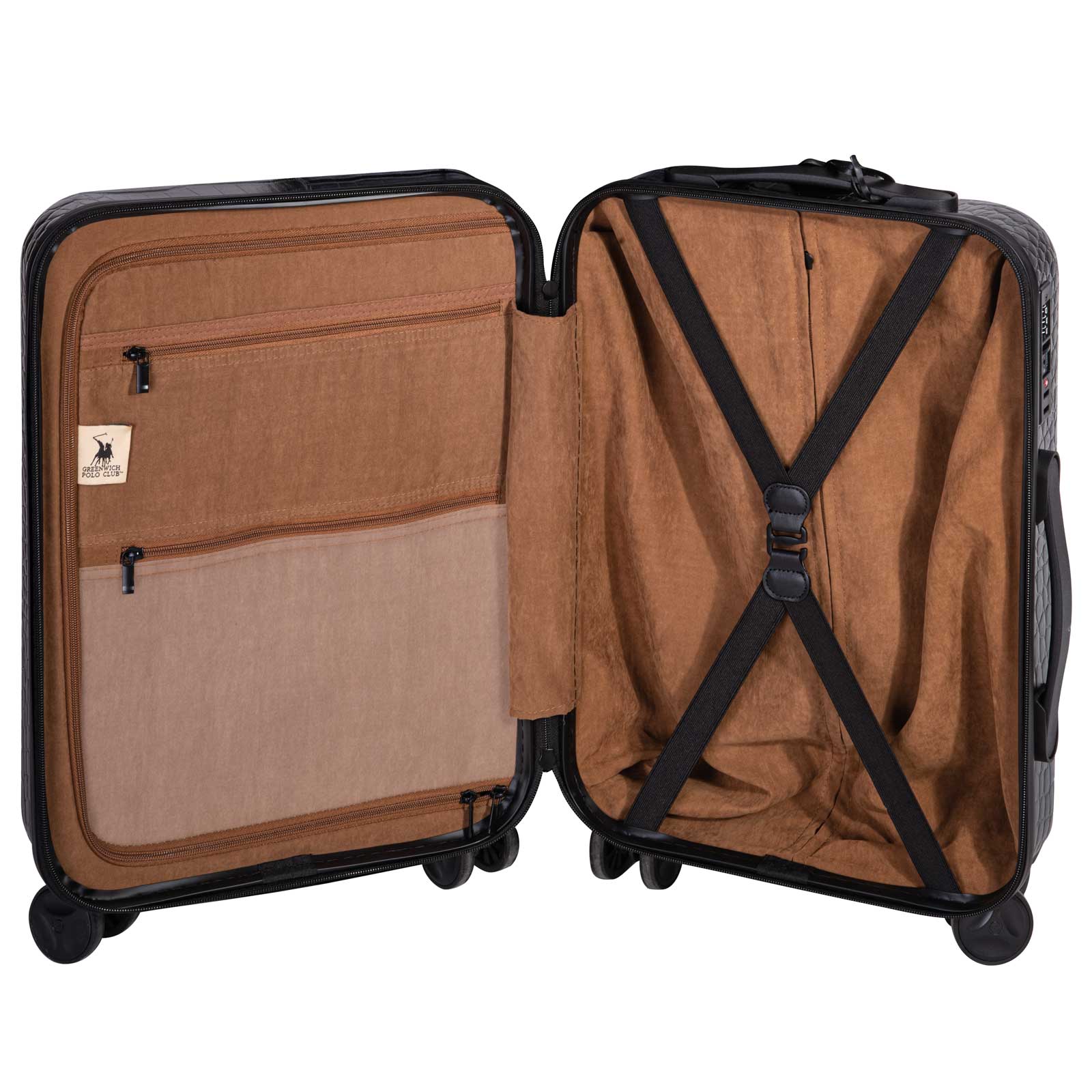 Βαλίτσα leather look του οίκου Greenwich Polo Club. Είναι κατασκευασμένη από πολύ ανθεκτικό υλικό κσι ενισχυμένες γωνίες από πολυπροπυλένιο. Επιπλέον διαθέτει 4 διπλές περιστρεφόμενες ρόδες για απόλυτη σταθερότητα και εσωτερικό τηλεσκοπικό μηχανισμό τρόλεϊ αλουμινίου. Ενσωματωμένη κλειδαριά συνδυασμού TSA 3 ψηφίων για ασφαλή ταξίδια. Εσωτερικά χωρίζει σε 2 ανεξάρτητα και ευρύχωρα διαμερίσματα, διαθέτει εσωτερικές θήκες, ιμάντες συγκράτησης και επένδυση suede. Διατίθεται σε διάσταση 56X37x22εκ. Επιλέξτε Greenwich Polo Club για να απολαύσετε ποιότητα, στυλ και πολυτέλεια.