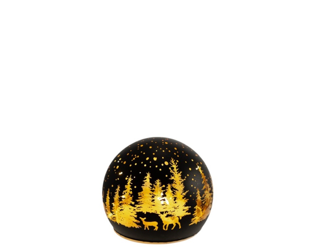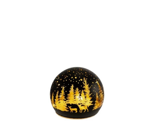 Κομψή γυάλινη μπάλα σε μαύρο-χρυσό χρωματισμό με ενσωματωμένο LED φωτισμό, που δημιουργεί εντυπωσιακό παιχνίδισμα φωτός μέσα από διάτρητα σχέδια δέντρων και ταράνδων. Το ζεστό φως της προσφέρει μια γιορτινή και ταυτόχρονα φινετσάτη αίσθηση σε οποιοδήποτε χώρο. Ιδανική για τραπεζάκι, ράφι ή ως μέρος χριστουγεννιάτικης σύνθεσης.