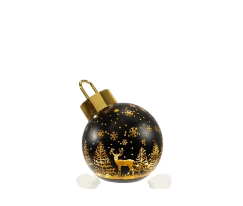 Εντυπωσιακή γυάλινη μπάλα σε μαύρο ματ φινίρισμα, διακοσμημένη με χρυσοτυπίες από έλατα, νιφάδες και ελάφια. Το μεταλλικό καπάκι στην κορυφή την κάνει να θυμίζει κλασικό στολίδι δέντρου, ενώ ο ενσωματωμένος LED φωτισμός μετατρέπει το σχέδιο σε ζωντανό χειμωνιάτικο σκηνικό. Ιδανική για χρήση σε ράφια, μπουφέδες ή τραπέζια, προσθέτοντας διακριτική πολυτέλεια και εορταστική ατμόσφαιρα.