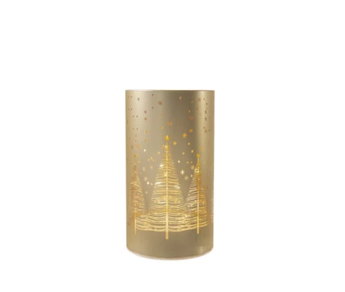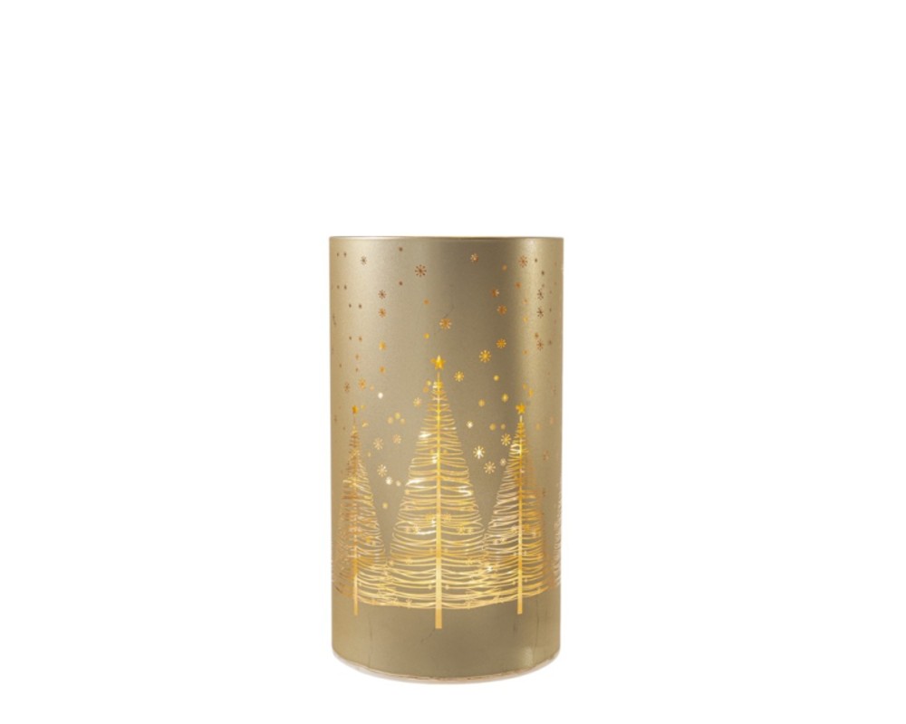 Εντυπωσιακή κυλινδρική βάση από χρυσό γυαλί, διακοσμημένη με λαμπερές παραστάσεις χριστουγεννιάτικων δέντρων και διάσπαρτα αστέρια. Ο ενσωματωμένος LED φωτισμός αναδεικνύει το σχέδιο και δημιουργεί ένα μοναδικό παιχνίδι φωτός, προσφέροντας ζεστή ατμόσφαιρα και εορταστική λάμψη. Τοποθέτησέ τη μόνη της ή συνδύασέ τη με άλλες βάσεις για πιο ολοκληρωμένο αποτέλεσμα.