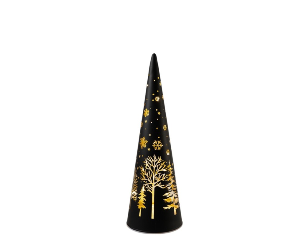 Φωτίστε τον χώρο σας με κομψότητα με το γυάλινο χριστουγεννιάτικο δέντρο LED σε μαύρο-χρυσό χρώμα, διακοσμημένο με σχέδιο δάσους και νιφάδες χιονιού. Ο εσωτερικός LED φωτισμός δημιουργεί ζεστή και μαγική αίσθηση, αναδεικνύοντας το χρυσό μοτίβο μέσα από το σκούρο φόντο. Ταιριάζει ιδανικά σε μπουφέ, τραπεζάκι, ράφι ή παράθυρο, προσθέτοντας λάμψη χωρίς υπερβολές.
