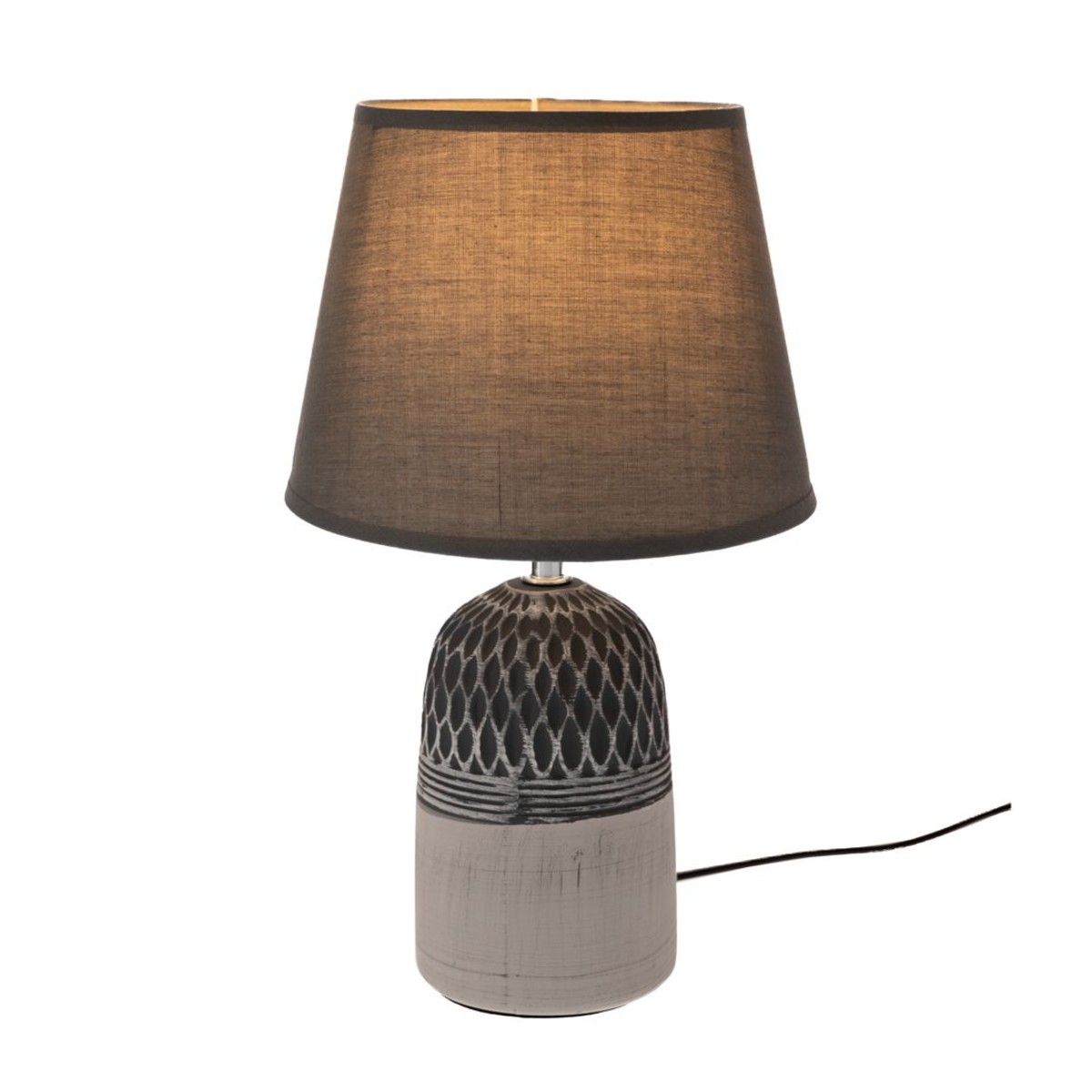 Το δίχρωμο γκρι κεραμικό λαμπατέρ Iliadis ξεχωρίζει για τη διακοσμητική βάση του, που συνδυάζει διαφορετική υφή και μοτίβο, δίνοντας χαρακτήρα στον χώρο χωρίς υπερβολές. Το γκρι καπέλο “μαλακώνει” το φως και δημιουργεί ατμόσφαιρα, ιδανική για χαλάρωση.