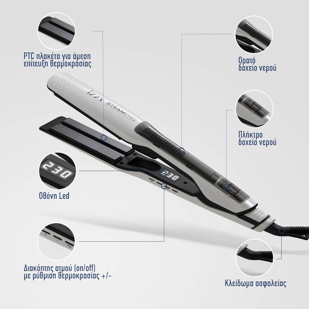 - Ευκολία στη Χρήση: Αποσπώμενο δοχείο νερού 15ml και επαγγελματικό περιστρεφόμενο καλώδιο 360° μήκους 1.8m για απόλυτη ελευθερία κινήσεων.