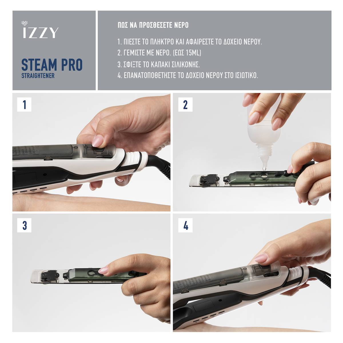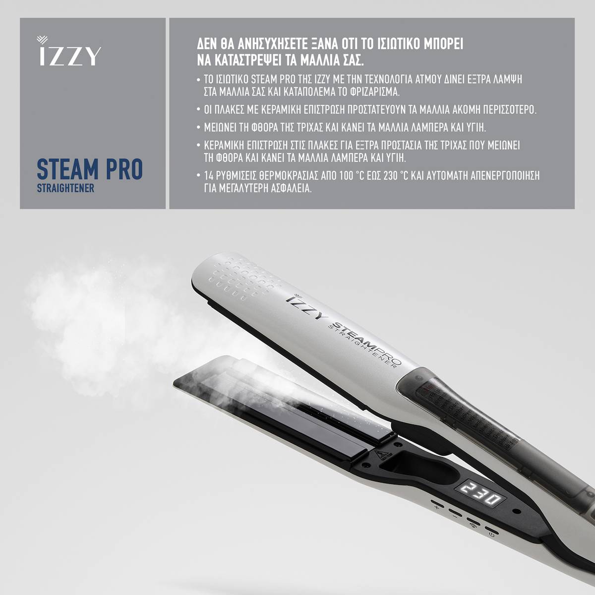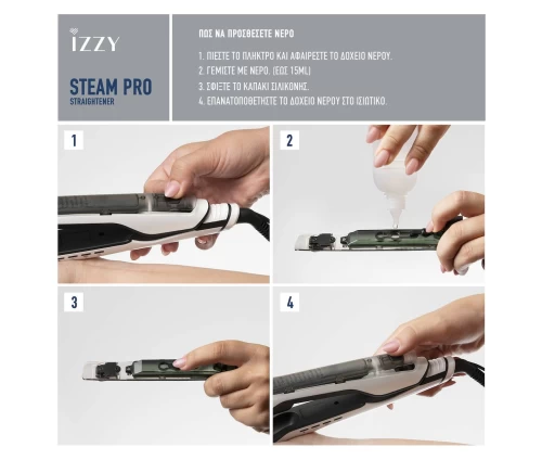 Είτε θέλετε ένα απόλυτα λείο αποτέλεσμα είτε ελαφριές μπούκλες στις άκρες, το Izzy Steam Pro είναι η ιδανική επιλογή για υγιή και λαμπερά μαλλιά κάθε μέρα.