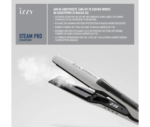 Απολαύστε αποτελέσματα κομμωτηρίου στο σπίτι με το ισιωτικό μαλλιών Izzy Steam Pro IZ-7106. Χάρη στην εξελιγμένη τεχνολογία ατμού, η συσκευή ενυδατώνει την τρίχα κατά τη διάρκεια του styling, προσφέροντας εξαιρετική λάμψη και προστασία από τη φθορά και το σπάσιμο.