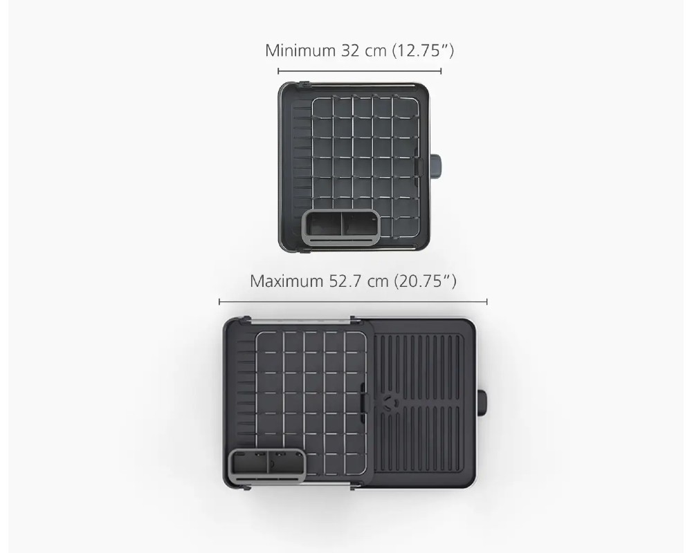 - Επεκτεινόμενος Σχεδιασμός: Με μια απλή κίνηση, ο στεγνωτήρας επεκτείνεται σχεδόν στο διπλάσιο του αρχικού του μεγέθους, προσφέροντας άπλετο χώρο για όλα σας τα πιάτα, ποτήρια και σκεύη.