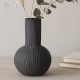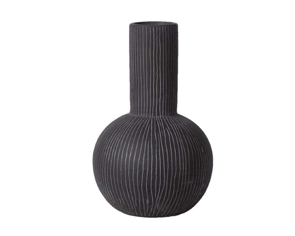 Με το χαρακτηριστικό σφαιρικό του σώμα και τον ψηλό, κομψό λαιμό, αυτό το βάζο αποτελεί ένα statement κομμάτι. Η επιφάνειά του, σε βαθιά ανθρακί απόχρωση, "σπάει" από κάθετες, ανάγλυφες γραμμές που θυμίζουν χειροποίητη λάξευση. Αυτή η ιδιαίτερη υφή του προσδίδει έναν γήινο και ταυτόχρονα minimal χαρακτήρα, δημιουργώντας ένα όμορφο παιχνίδισμα με το φως.