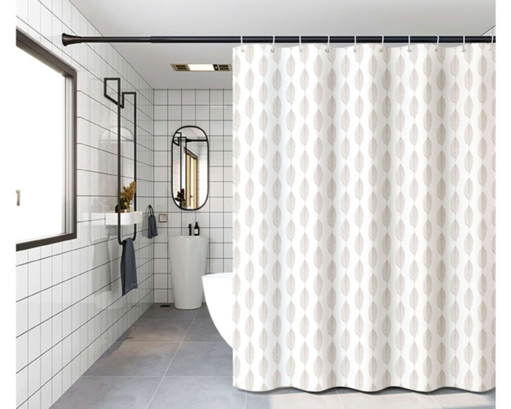 - Κουρτίνα πολυεστερική 90gsm, αδιάβροχη, με μοτίβο από λεπτά φύλλα σε απαλή μπεζ απόχρωση, πάνω σε λευκή βάση