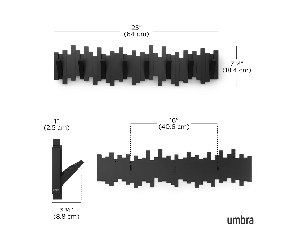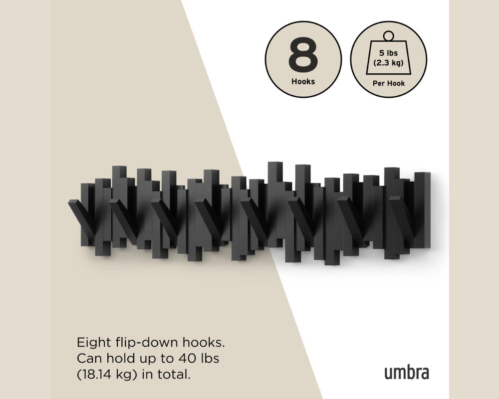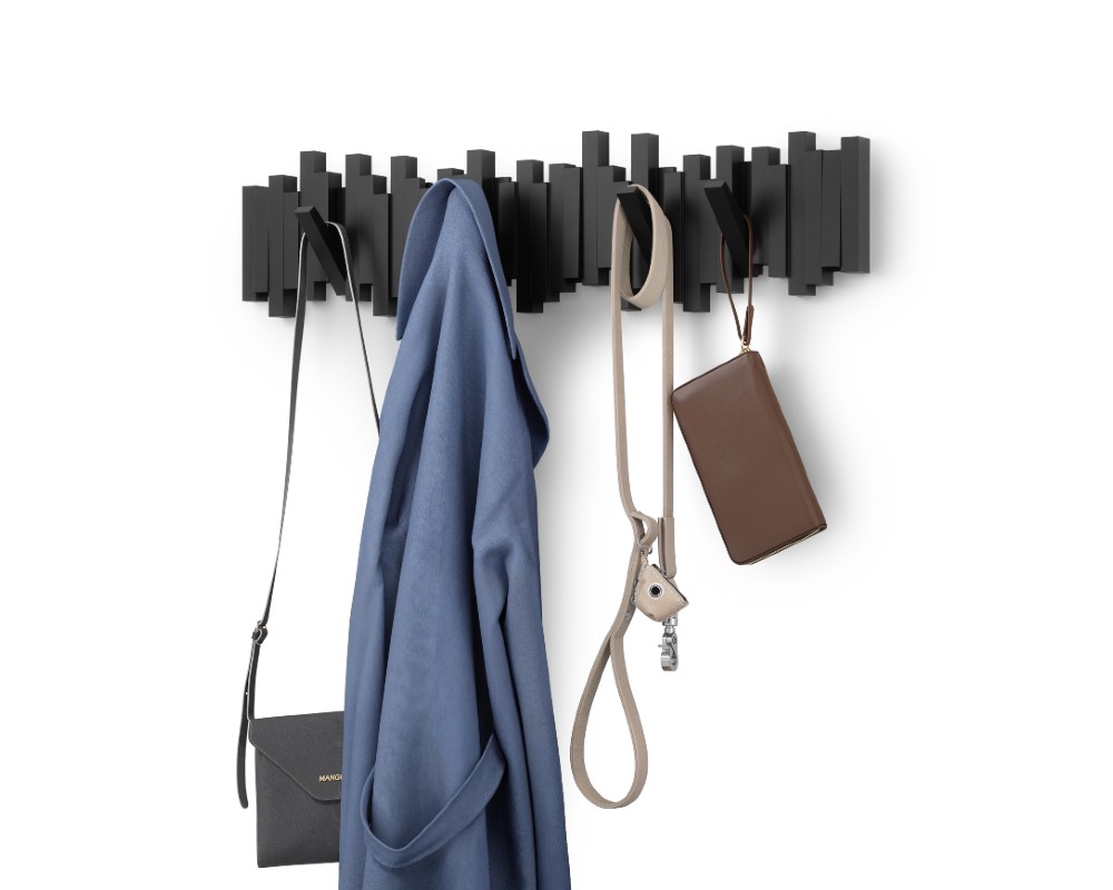 Ο έξυπνος σχεδιασμός της, που θυμίζει τυχαία τοποθετημένα ξύλα, κρύβει 8 στιβαρούς γάντζους. Κάθε «stick» λειτουργεί ως ένας αναδιπλούμενος γάντζος που κατεβαίνει για να κρεμάσετε παλτό, τσάντες, κασκόλ ή ομπρέλες, και κλείνει προς τα πάνω όταν δεν χρησιμοποιείται, διατηρώντας μια καθαρή και γλυπτική εμφάνιση.