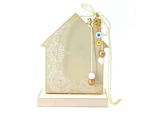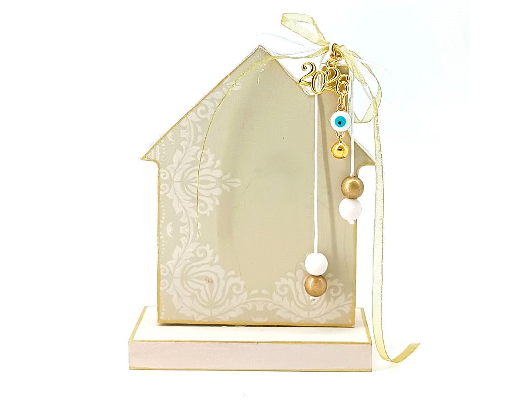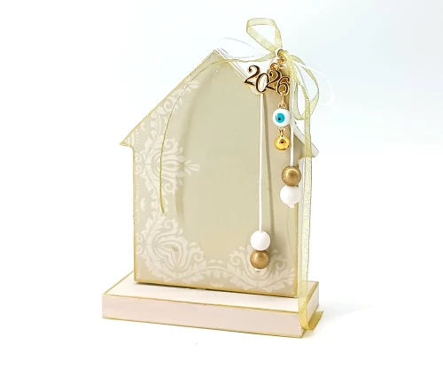 Το ξύλινο γούρι σπιτάκι KorresCraft είναι χειροποίητο γιορτινό δημιούργημα, κατασκευασμένο στην Ελλάδα από MDF με την τεχνική decoupage. Διαθέτει κορδέλες, χάντρες και μεταλλικά στοιχεία σε απαλούς χρυσούς τόνους που το κάνουν ιδανικό να τοποθετηθεί σε κάθε χώρο ή να προσφερθεί ως δώρο, φέρνοντας μια ευχάριστη και ζεστή νότα στο σπίτι.