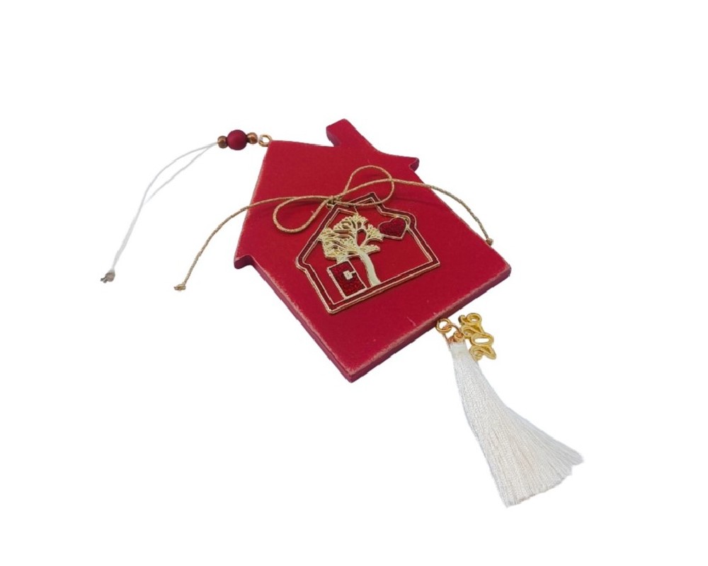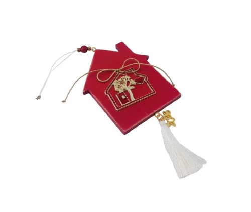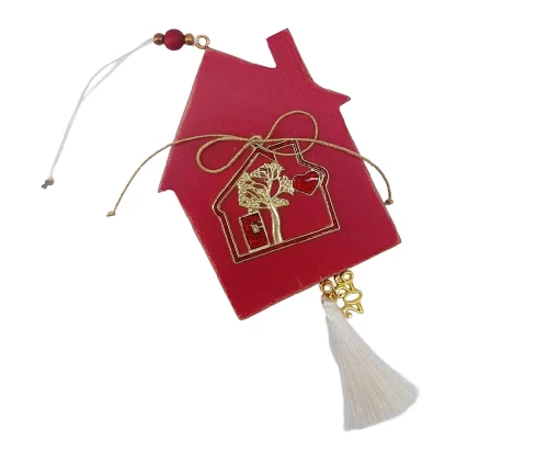 Το ξύλινο κρεμαστό γούρι σπίτι KorresCraft είναι χειροποίητο και κατασκευασμένο στην Ελλάδα από MDF, με τεχνητή παλαίωση. Διαθέτει φούντα, χάντρες και μεταλλικό μοτίφ σπιτιού διακοσμημένο με σμάλτο σε κόκκινο χρώμα.