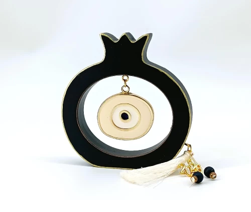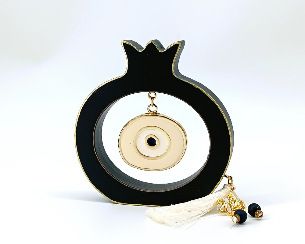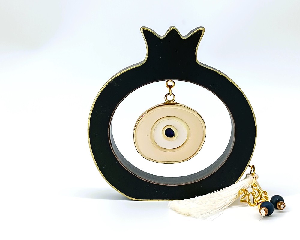 Διαθέτει μεταλλικό στοιχείο ματιού με σμάλτο, φούντα και χάντρες, συνδυάζοντας παραδοσιακά και σύγχρονα στοιχεία. Κατάλληλο για εποχιακή διακόσμηση ή ως δώρο για το νέο έτος.